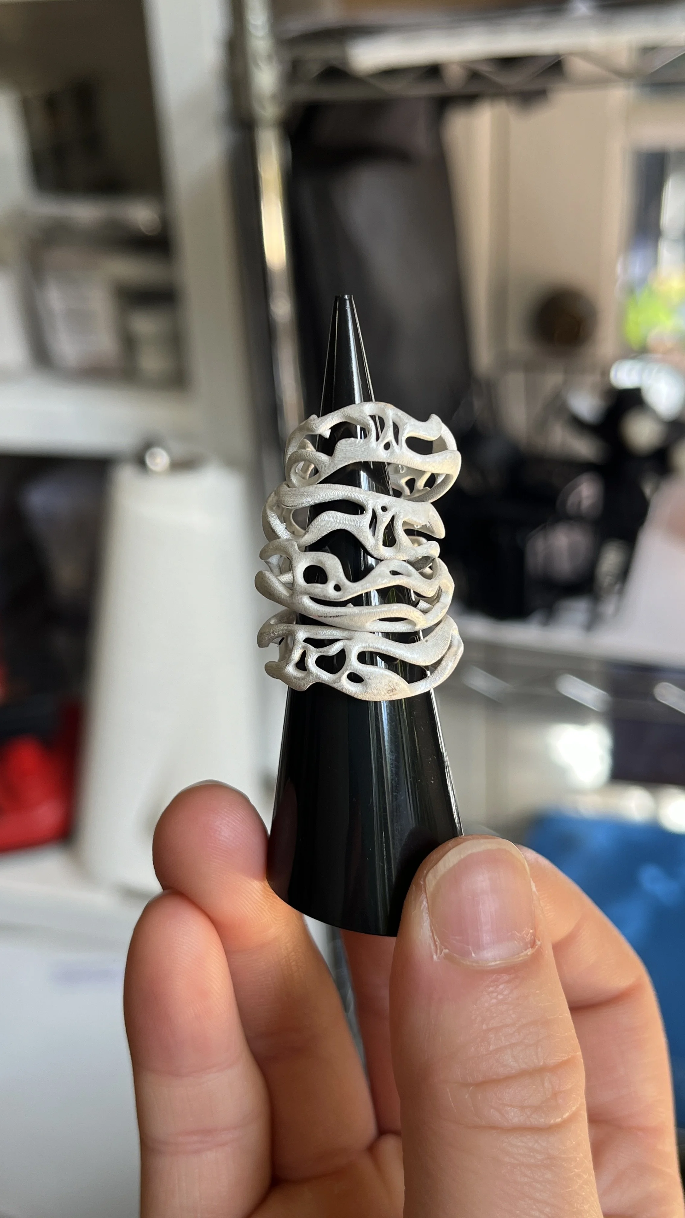 the inversion of wearing your internal moods as external adornment is physically mirrored in the cellular structure of my designs, which transform our ever-mutating internal anatomy into static silver exoskeletons. I am particularly inspired by my experiences on hormone replacement therapy (HRT) and the fact that we are infinitely capable of change, even at the cellular level. every day we replace over 300 billion cells: as my own voice, face, and body changes with each cycle of cell division, I am increasingly drawn to organic forms and fleshy, fluid shapes in jewelry as well.